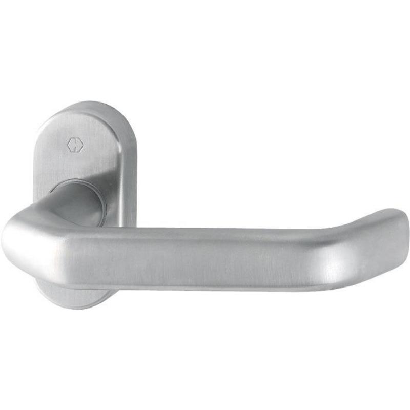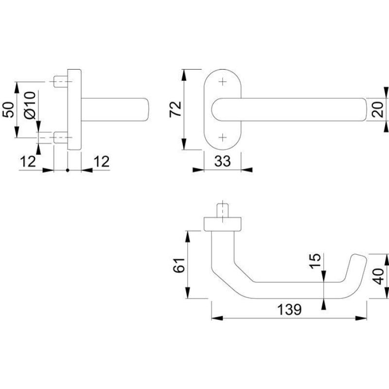 Edelstahl-Feuerschutz-Rosetten-Türgriff-Halbgarnitur ohne Schlüsselrosette für Profiltüren: geprüft nach DIN 18273 Lagerung: gekröpfter Türgriff fest/drehbar · Rückholfeder · wartungsfreies Gleitlager Verbindung: für HOPPE-Profilvollstift (separat bestellen) Unterkonstruktion: Zamak mit Stahleinlage Befestigung: verdeckt · Gewindeschrauben und Blindsteckmuttern M5 · 9 mm Vierkant