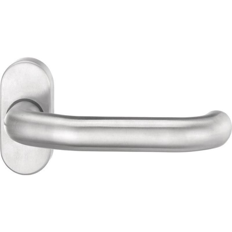 für Rahmentüren · schräg, fest-drehbar auf ovaler Rosette mit Hochhaltefeder · Rosette: Stärke 14,5 mm · Höhe 75 mm · Breite 34 mm · unsichtbare Verschraubung · Lieferung ohne Stift und Schrauben · DIN links / rechts