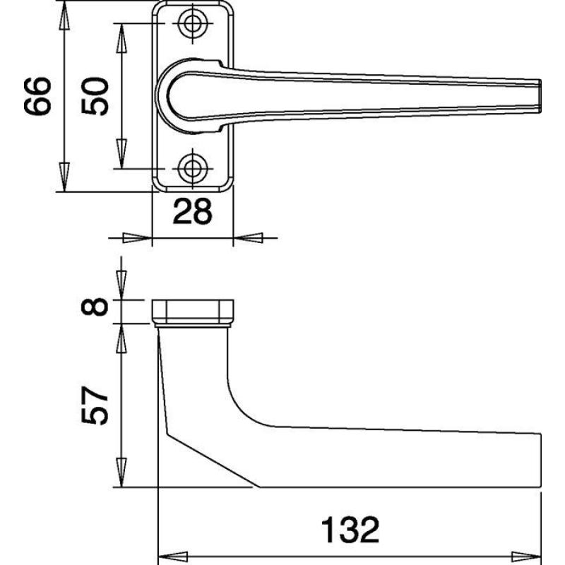Weitere technische Eigenschaften · Breite: 28mm · Drückerlänge: 132mm · Drückertiefe: 66mm · Stärke: 8mm · Anschlagrichtung: DIN links / rechts · Lagerung: fest-drehbar · Rosetten-Höhe: 66mm · Profiltürdrückerlochteil · 3314/0000 Alu.F1 ktg.8mm · gekr.EDI ·