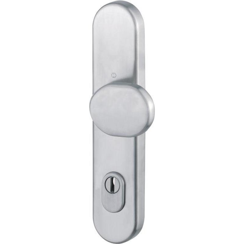 für Kombischutz · geprüft nach DIN 18257 ES1 (SK2) · mit Zylinderabdeckung: gehärteter Stahl, für vorstehende Zylinderlänge 10-18 mm · Stahl-Unterkonstruktion · verdeckte, durchgehende Befestigung · Lochung PZ · kombinierbar mit Halbgarnituren für Kombi-Schutz · DIN links / rechts