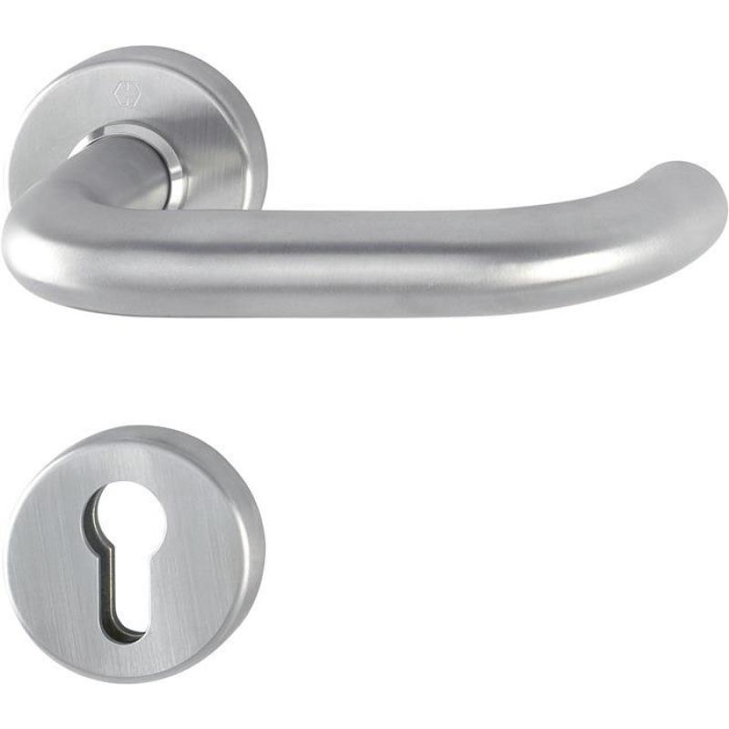 für Kombischutz · Edelstahl-Rosetten-Türgriff-Halbgarnitur mit Schlüsselrosette für Außen-/Wohnungsabschluss-Türen (Innenseite) · Lagerung: Türgriff lose, wartungsfreies Gleitlager · Verbindung: Schnellstift mit Vollstift (separat bestellen) · Unterkonstruktion: Stahl, Stütznocken · Befestigung: verdeckt, durchgehend, für Gewindeschrauben M5 · Besonderheit: kombinierbar mit Knopflangschild ES1 (SK2) für Kombi-Schutz · DIN links / rechts