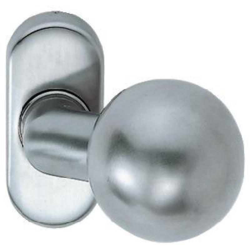 Rahmentür-Kugelknopf schräg, auf ovaler Rosette mit unsichtbarer Befestigung für Senkschrauben M5 (Schraublochabstand 50 mm) mit Hochhaltefeder · mit 8 mm Lochung (Standard-Vierkant) fest/drehbar gelagert oder M12 mm feststehend · DIN links / rechts · Lieferung ohne Stift und Schrauben
