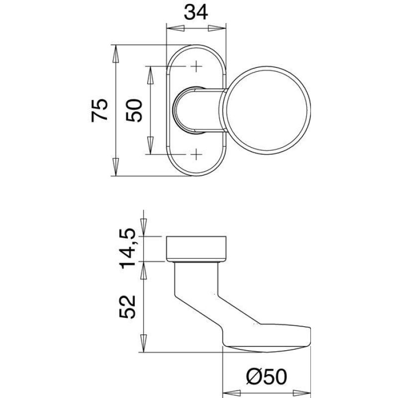 für Rahmentüren · schräg, auf ovaler Rosette · mit unsichtbarer Befestigung · Höhe 75 mm · Breite 34 mm · Stärke 14,5 mm · Schraublochabstand 50 mm · fest oder fest/drehbar (federnd gelagert) · DIN links / rechts · Lieferung ohne Stift und Schrauben