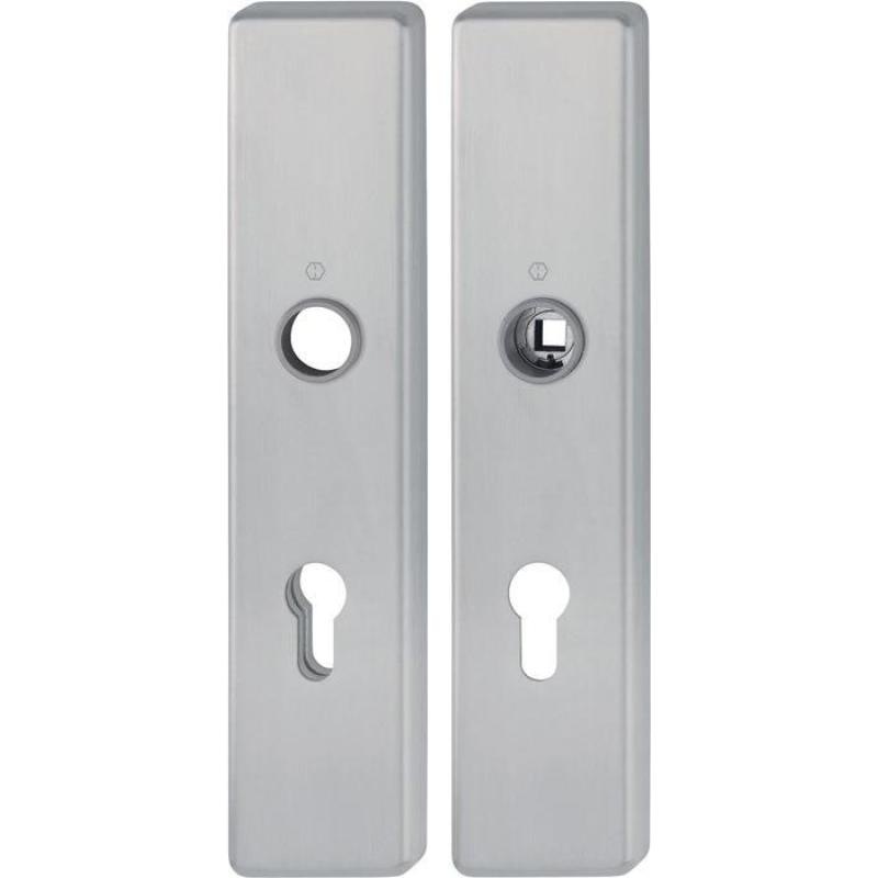 für Außen-/Wohnungsabschluss-Türen · zertifiziert nach DIN 18257 ES1, erfüllt die Anforderungen nach DIN EN 1906: 37-0142A (SK2) in Verbindung mit den passenden Türgriffen, Objekt-Garnitur · Gebrauchskategorie Klasse 3 Lagerung: für Türgriffe lose, Rückholfeder rechts/links verwendbar, wartungsfreie Gleitlager Verbindung: HOPPE-Vollstift für HOPPE-Schnellstift (Lochteile) Unterkonstruktion: außen Stahl, innen Aluminium, Stütznocken Befestigung: verdeckt, durchgehend, Gewindeschrauben M6 Das Schutz-Langschild-Paar ist ausschließlich mit HOPPESchnellstift-Türgriff-Lochteilen kombinierbar und entspricht nur so den Anforderungen der Schutzklasse ES1 (SK2).