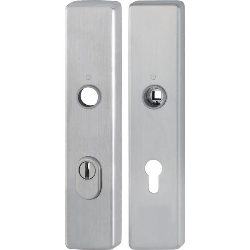 mit Zylinder-Abdeckung für Außen-/Wohnungsabschluss-Türen · zertifiziert nach DIN 18257 ES1, erfüllt die Anforderungen nach DIN EN 1906: 37-0142A (SK2) in Verbindung mit den passenden Türgriffen, Objekt-Garnitur · Gebrauchskategorie Klasse 3 Lagerung: für Türgriffe lose, Rückholfeder rechts/links verwendbar, wartungsfreie Gleitlager Verbindung: HOPPE-Vollstift für HOPPE-Schnellstift (Lochteile) Zylinder-Abdeckung: gehärteter Stahl, für vorstehende Zylinderlänge 10-18 mm Unterkonstruktion: außen Stahl, innen Aluminium, Stütznocken Befestigung: verdeckt, durchgehend, Gewindeschrauben M6 Das Schutz-Langschild-Paar ist ausschließlich mit HOPPESchnellstift-Türgriff-Lochteilen kombinierbar und entspricht nur so den Anforderungen der Schutzklasse ES1 (SK2).