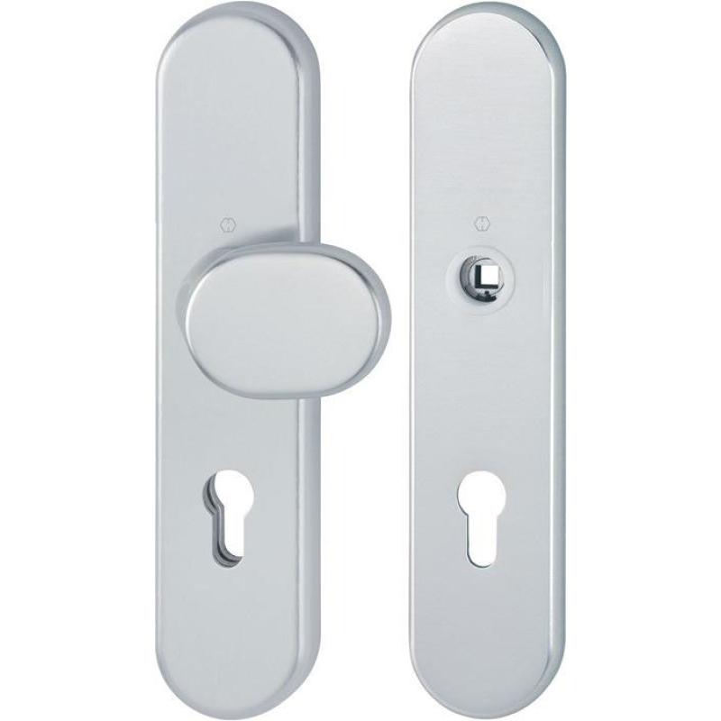 ohne Türgriff für Außen-/Wohnungsabschluss-Türen · zertifiziert nach DIN 18257 ES1, erfüllt die Anforderungen nach DIN EN 1906: 37-0142A (SK2) in Verbindung mit den passenden Türgriffen, Objekt-Garnitur · Gebrauchskatagorie Klasse 3 · PZ Lagerung: außen gekröpfter Knopf fest, ummontierbar, innen für Türgriff lose, Rückholfeder rechts/links verwendbar, wartungsfreies Gleitlager Verbindung: HOPPE-FDW-Vollstift für HOPPE-Schnellstift (Lochteil) Unterkonstruktion: außen Stahl, innen Aluminium, Stütznocken Befestigung: verdeckt, durchgehend, Gewindeschrauben M6 Die Schutz-Langschild-Wechsel-Garnitur ist ausschließlich mit HOPPE-Schnellstift-Türgriff-Lochteilen kombinierbar und entspricht nur so den Anforderungen der Schutzklasse ES1 (SK2).