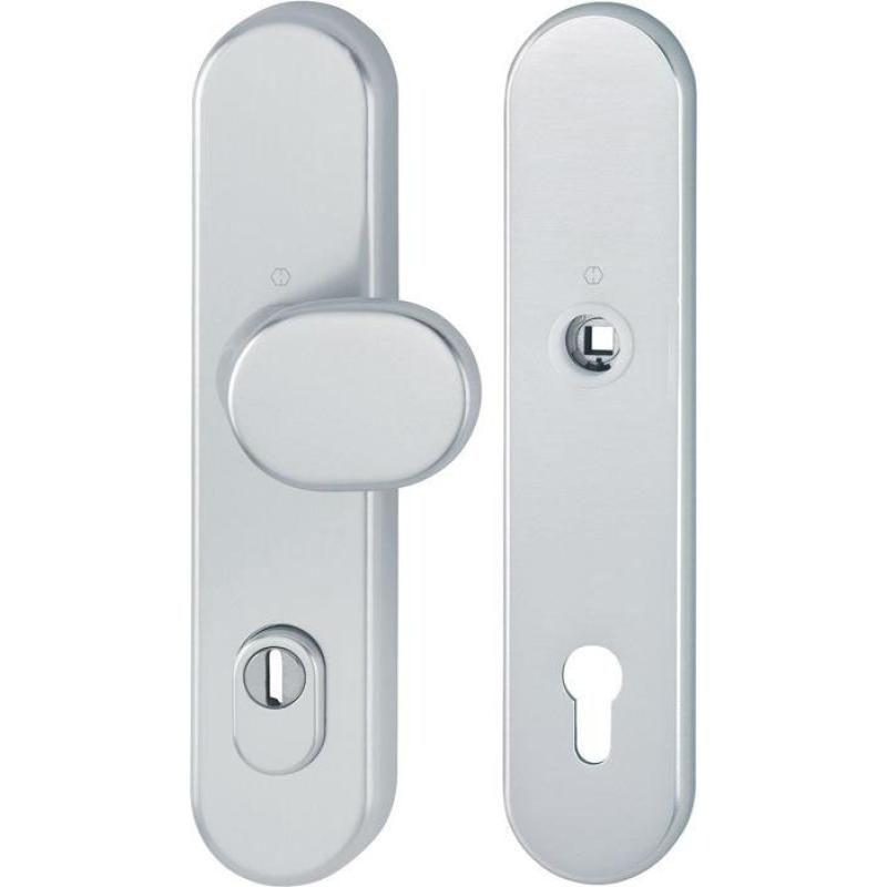 mit Zylinder-Abdeckung · ohne Türgriff für Außen-/Wohnungsabschluss-Türen · zertifiziert nach DIN 18257 ES1, erfüllt die Anforderungen nach DIN EN 1906: 37-0142A (SK2) in Verbindung mit den passenden Türgriffen, Objekt-Garnitur · Gebrauchskategorie Klasse 3 · PZ Lagerung: außen gekröpfter Knopf fest, ummontierbar, innen für Türgriff lose, Rückholfeder rechts/links verwendbar, wartungsfreies Gleitlager Verbindung: HOPPE-FDW-Vollstift für HOPPE-Schnellstift (Lochteil) Zylinder-Abdeckung: gehärteter Stahl, für vorstehende Zylinderlänge 10-18 mm Unterkonstruktion: außen Stahl, innen Aluminium, Stütznocken Befestigung: verdeckt, durchgehend, Gewindeschrauben M6 Die Schutz-Langschild-Wechsel-Garnitur ist ausschließlich mit HOPPE-Schnellstift-Türgriff-Lochteilen kombinierbar und entspricht nur so den Anforderungen der Schutzklasse ES1 (SK2).