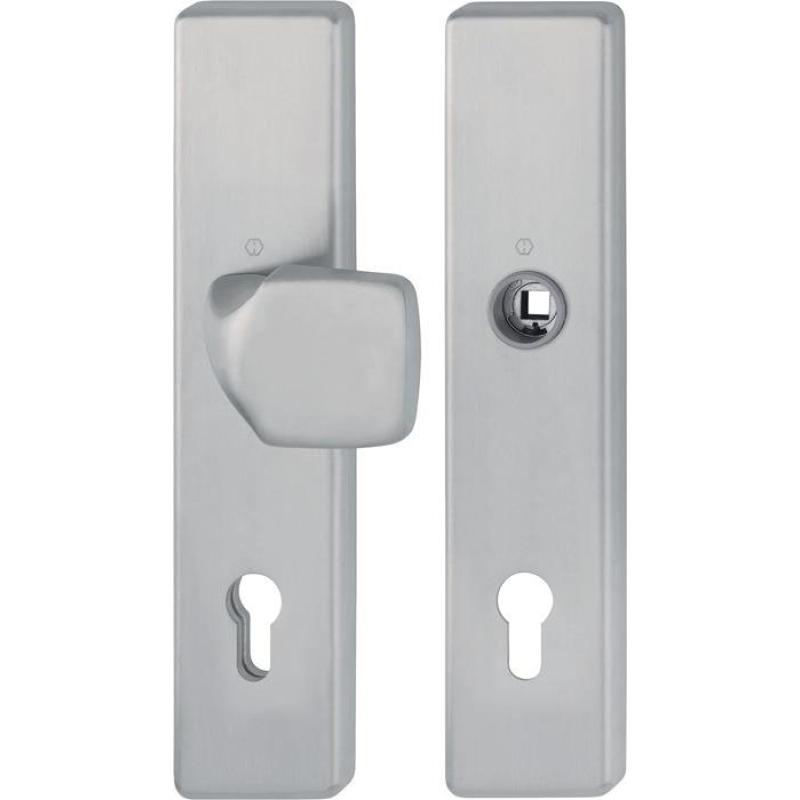ohne Türgriff für Außen-/Wohnungsabschluss-Türen · zertifiziert nach DIN 18257 ES1, erfüllt die Anforderungen nach DIN EN 1906: 37-0142A (SK2) in Verbindung mit den passenden Türgriffen, Objekt-Garnitur · Gebrauchskategorie Klasse 3 · PZ Lagerung: außen gekröpfter Knopf fest, ummontierbar, innen für Türgriff lose, Rückholfeder rechts/links verwendbar, wartungsfreies Gleitlager Verbindung: HOPPE-FDW-Vollstift für HOPPE-Schnellstift (Lochteil) Unterkonstruktion: außen Stahl, innen Aluminium, Stütznocken Befestigung: verdeckt, durchgehend, Gewindeschrauben M6 Die Schutz-Langschild-Wechsel-Garnitur ist ausschließlich mit HOPPE-Schnellstift-Türgriff-Lochteilen kombinierbar und entspricht nur so den Anforderungen der Schutzklasse ES1 (SK2).