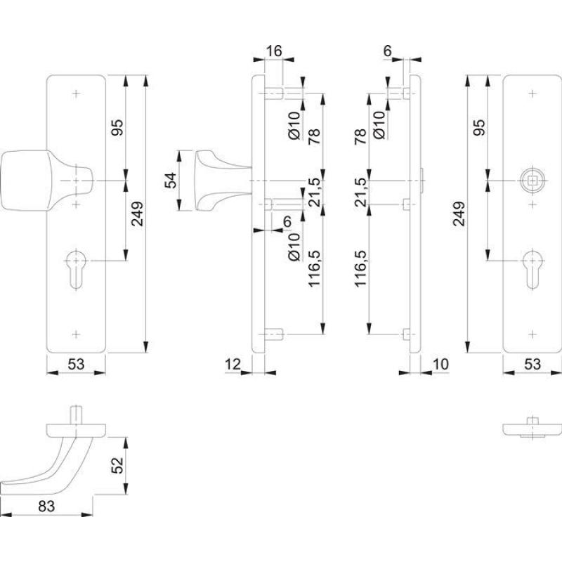 Weitere technische Eigenschaften · Breite: 53mm · Länge: 249mm · Abdeckung: ohne Zylinderabdeckung · Schildstärke: 12mm · Ergänzung: abgesetzter Vierkant · Schutzgarnitur · E61G/2221/2210 VA F69 · 92mm 67-77mm HOPPE ·