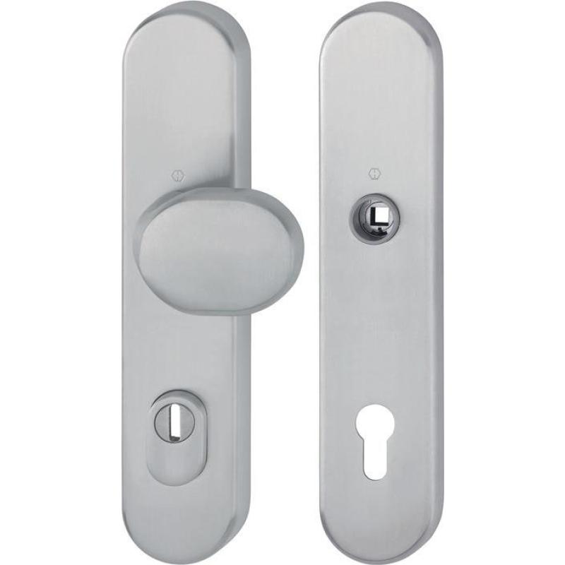 mit Zylinder-Abdeckung · ohne Türgriff für Außen-/Wohnungsabschluss-Türen · zertifiziert nach DIN 18257 ES1, erfüllt die Anforderungen nach DIN EN 1906: 37-0142A (SK2) in Verbindung mit den passenden Türgriffen, Objekt-Garnitur · Gebrauchskategorie Klasse 3 · PZ Lagerung: außen gekröpfter Knopf fest, ummontierbar, innen für Türgriff lose, Rückholfeder rechts/links verwendbar, wartungsfreies Gleitlager Verbindung: HOPPE-FDW-Vollstift für HOPPE-Schnellstift (Lochteil) Zylinder-Abdeckung: gehärteter Stahl, für vorstehende Zylinderlänge 10-18 mm Unterkonstruktion: außen Stahl, innen Aluminium, Stütznocken Befestigung: verdeckt, durchgehend, Gewindeschrauben M6 Die Schutz-Langschild-Wechsel-Garnitur ist ausschließlich mit HOPPE-Schnellstift-Türgriff-Lochteilen kombinierbar und entspricht nur so den Anforderungen der Schutzklasse ES1 (SK2).