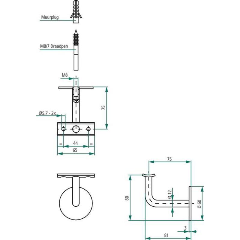 Weitere technische Eigenschaften · Durchmesser Wandplatte: 60mm · Wandabstand: 75mm · Handlaufträger VA ma · D.Wandplatte 60mm · gewölbte Auflage ·