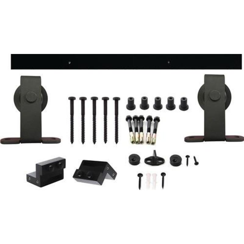 Komplettset für Holzflügel · das Set 1 Tür besteht aus: 2 Stahlschienen von 1000mm · 2 gelagerte Stahlhänger · 2 Türstopper aus Stahl · 2 Abstandhalter für die Tür · 1 Schiebetür-Bodenführung · Befestigungsmaterial · für Türstarke von 38 bis 40 mm · schwarz