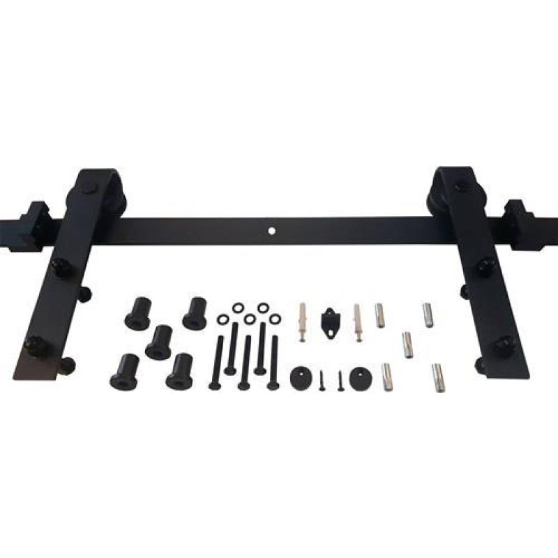Komplettset für Holzflügel · das Set 1 Tür besteht aus: 2 Stahlschienen von 1000mm · 2 gelagerte Stahlhänger · 2 Türstopper aus Stahl · 2 Abstandhalter für die Tür · 1 Schiebetür-Bodenführung · Befestigungsmaterial · für Türstarke von 38 bis 40 mm · schwarz