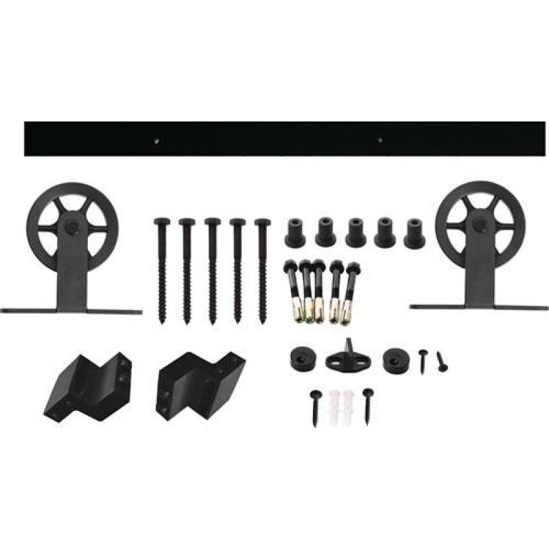 Komplettset für Holzflügel · das Set 1 Tür besteht aus: 2 Stahlschienen von 1000mm · 2 gelagerte Stahlhänger · 2 Türstopper aus Stahl · 2 Abstandhalter für die Tür · 1 Schiebetür-Bodenführung · Befestigungsmaterial · für Türstarke von 38 bis 40 mm · schwarz