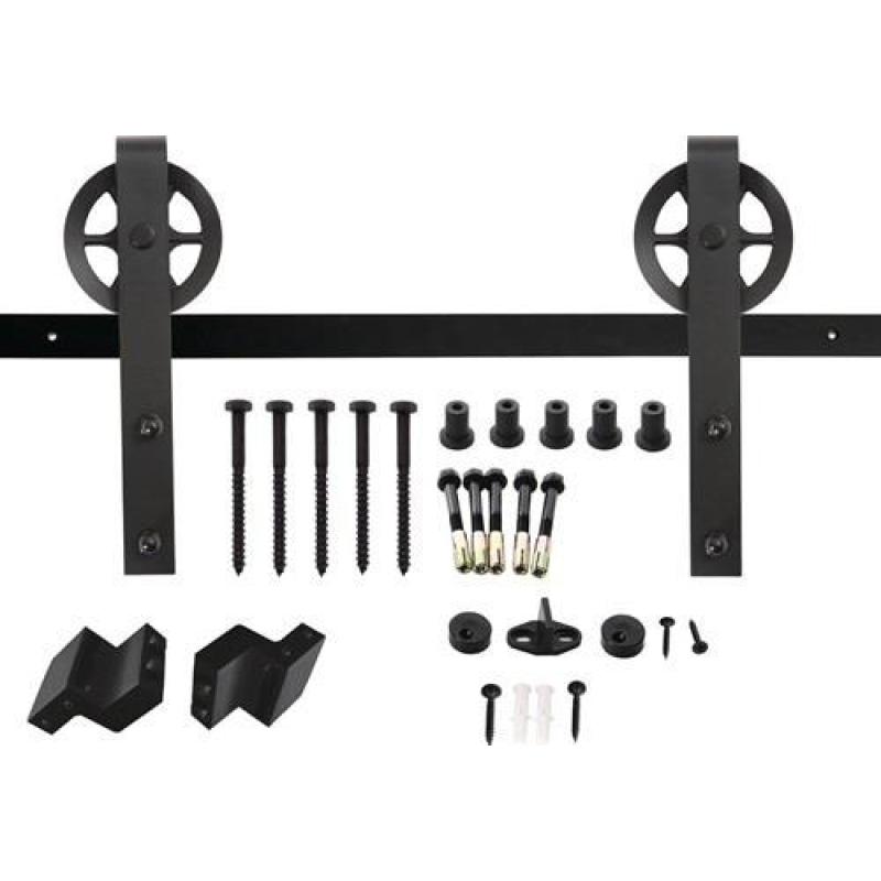 Komplettset für Holzflügel · das Set 1 Tür besteht aus: 2 Stahlschienen von 1000mm · 2 gelagerte Stahlhänger · 2 Türstopper aus Stahl · 2 Abstandhalter für die Tür · 1 Schiebetür-Bodenführung · Befestigungsmaterial · für Türstarke von 38 bis 40 mm · schwarz