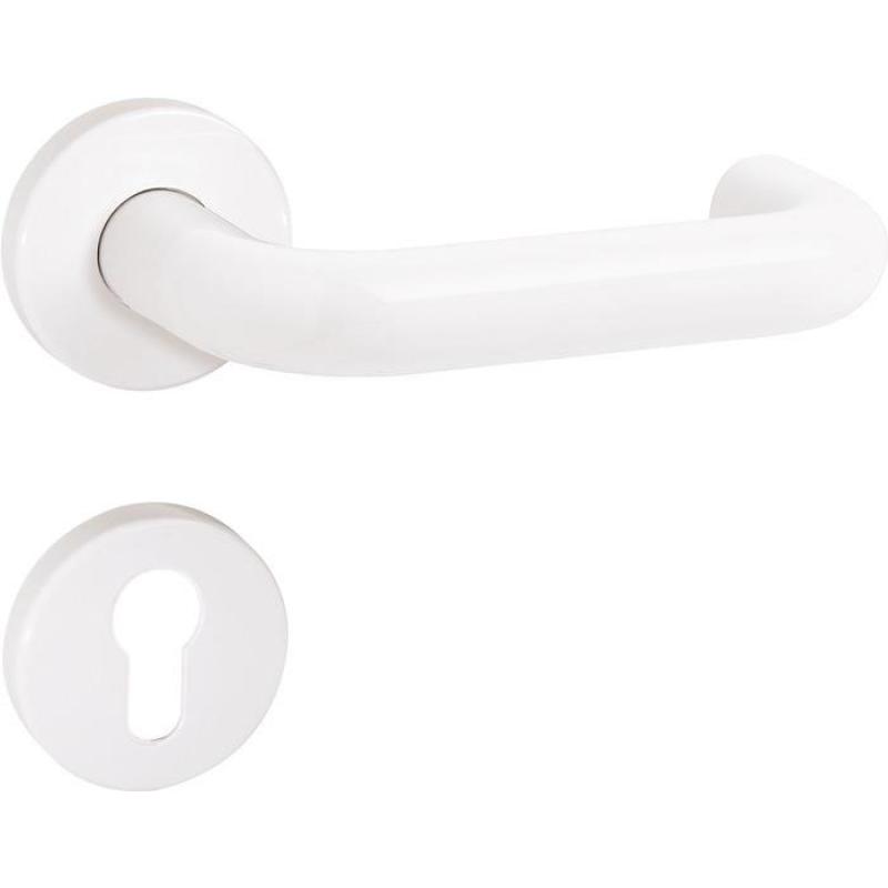 in R-Technik mit Rosetten nach DIN 18255 und DIN EN 1906 aus Polyamid, Oberfläche hochglänzend, bestehend aus: Türdrücker in U-Form aus Polyamid mit durchgehendem Stahlkern bis in das Drückerende, durchgängig eingefärbt, Durchmesser 23 mm, mit Ansatzführung und Rastnut, Montage durch einfaches Einrasten der Türdrücker in die auf der Tür vormontierten Unterteile. Die Rastung kann mittels Demontageschlüssel wieder gelöst werden. Der Drücker erfüllt die Vorgaben der DIN EN 179 und DIN 18040. Rosettenunterkonstruktion in Kunststoff-Edelstahlverbundbau, DIN links und DIN rechts verwendbar. Festdrehbarlagerung der Drücker mit selbsttätig einrastender Rundumverriegelung und 5 mm Lagerstelle als wartungsfreies Gleitlager mit elastischem Ausgleichsbereich und zweiter Lagerstelle im Drückerhals. Verdeckte, lockerungssichere Verschraubung mit M4 Schrauben- und Hülsenschraubenkombination sowie Stützzapfen. Rosetten-Abdeck-Kappe, rund, aus Polyamid durchgängig eingefärbt, Durchmesser 55 mm, 13 mm hoch, gewölbt, 1,5 mm Wandstärke. Lochung PZ Ausgelegt und geprüft für den Objektbereich, Benutzerkategorie nach DIN EN 1906 - Klasse 4 Feuerschutzgarnitur mit Vierkantstift 9 mm, nach DIN 18273 · Drückergarnitur · Drückerlänge 150 mm