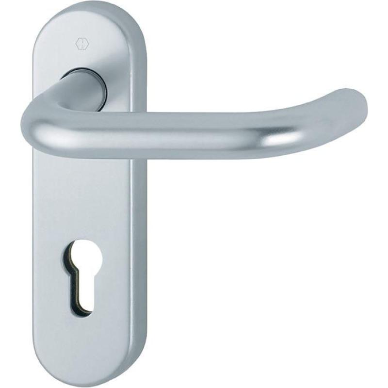 Aluminium-Feuerschutz-Kurzschild-Türgriff-Garnitur für Innentüren · geprüft nach DIN 18273 und DIN EN 1906: 47-D1150A und PIVCERTPlus (1.000.000 Prüfzyklen) · Objekt-Garnitur (Gebrauchskategorie 4) · Lagerung: Türgriffe fest/drehbar · Rückholfedern · HOPPE-Steckgriff-Verbindung mit Kugel-Arretierung Sertos® · wartungsfreie Gleitlager · Verbindung: HOPPE-Profilvollstift 9 mm · Lochung PZ · Entfernung 72 mm · Unterkonstruktion: Stahl · Stütznocken · Befestigung: verdeckt, durchgehend, Gewindeschrauben M5 · Besonderheit: Türgriffe mit Stahlkernen · Anschlagrichtung DIN links / rechts