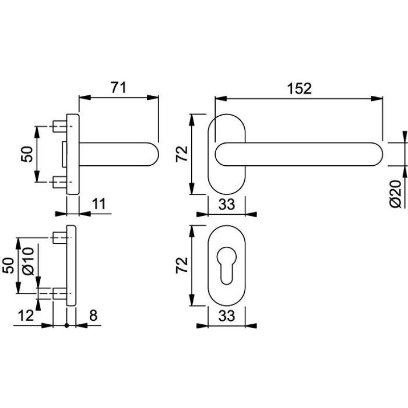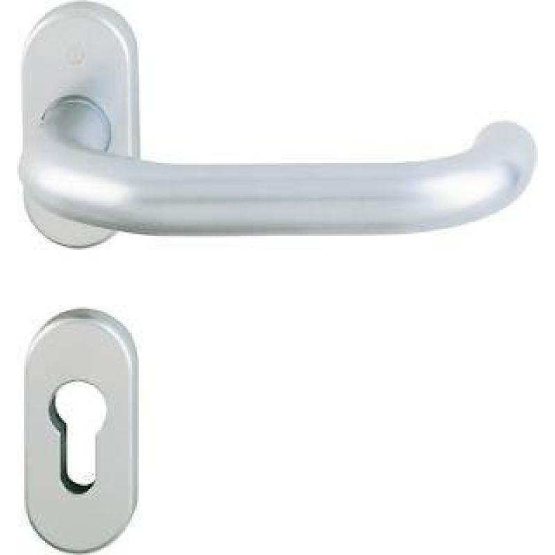 geprüft nach DIN 18273 · Drückerlänge 141 mm · fest / drehbar gelagert im wartungsfreien Gleitlager der Stahl-Unterkonstruktion · mit Rückholfeder · mit HOPPE-Profilvollstift-Verbindung 9 mm (mit Klemmfeder zum Toleranzausgleich in der Schlossnuss) · mit Ovalrosetten 33 x 72 mm · verdeckte Verschraubung mittels Blindsteckmuttern · für Türstärke 55-75 mm · Lochung PZ · DIN links / rechts verwendbar · Drückergarnitur