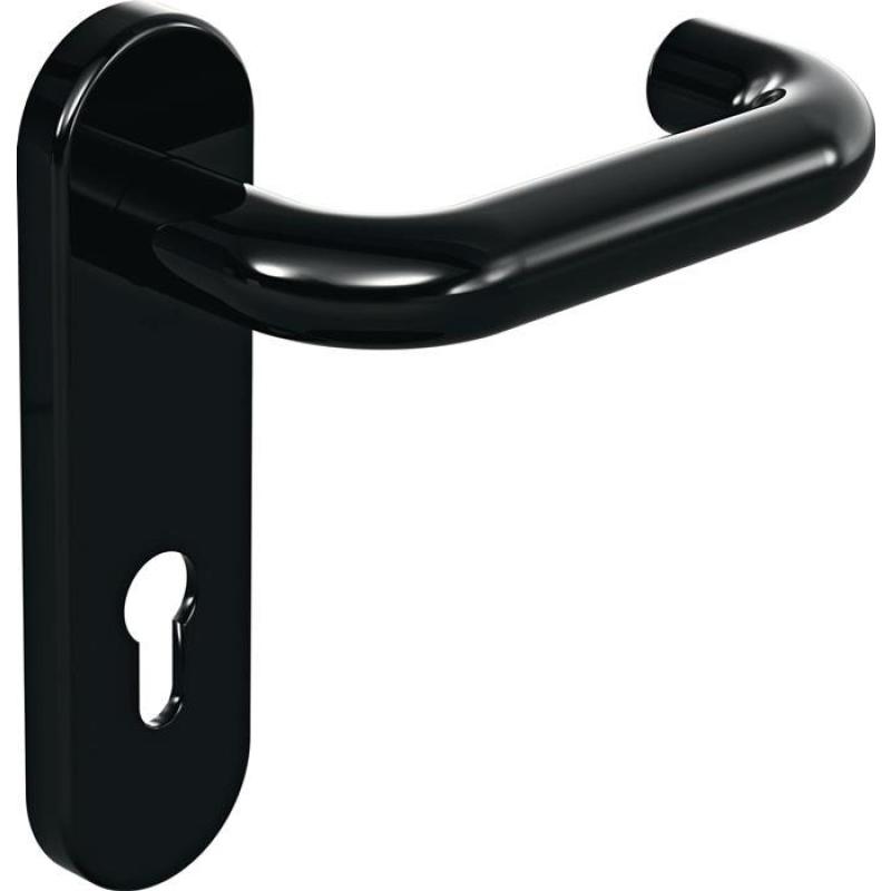 in R-Technik mit Schildern nach DIN 18255 und DIN EN 1906 aus Polyamid, Oberfläche hochglänzend, bestehend aus: Türdrücker in U-Form aus Polyamid mit durchgehendem Stahlkern bis in das Drückerende, durchgängig eingefärbt, Durchmesser 20 mm, mit Ansatzführung und Rastnut, Montage durch einfaches Einrasten der Türdrücker in die auf der Tür vormontierten Unterteile. Die Rastung kann mittels Demontageschlüssel wieder gelöst werden. Der Drücker erfüllt die Vorgaben der DIN EN 179 und DIN 18040. Schildunterkonstruktion in Kunststoff-Edelstahlverbundbau, DIN links und DIN rechts verwendbar. Festdrehbarlagerung der Drücker mit selbsttätig einrastender Rundumverriegelung und 5 mm Lagerstelle als wartungsfreies Gleitlager mit elastischem Ausgleichsbereich und zweiter Lagerstelle im Drückerhals. Verdeckte, lockerungssichere Verschraubung mit M4 Schrauben- und Hülsenschraubenkombination sowie Stützzapfen. Schild-Abdeck-Kappe aus Polyamid durchgängig eingefärbt, 46 x 180 mm, 13 mm hoch, gewölbt, 1,5 mm Wandstärke. Ausgelegt und geprüft für den Objektbereich, Gebrauchs-Kategorie nach DIN EN 1906 - Klasse 4 Garnitur mit Vierkantstift 8 mm · Drückerlänge 138 mm · Drückergarnitur · Entfernung 72 mm