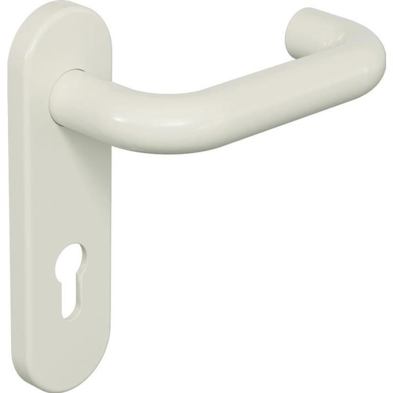 in R-Technik mit Schildern nach DIN 18255 und DIN EN 1906 aus Polyamid, Oberfläche hochglänzend, bestehend aus: Türdrücker in U-Form aus Polyamid mit durchgehendem Stahlkern bis in das Drückerende, durchgängig eingefärbt, Durchmesser 20 mm, mit Ansatzführung und Rastnut, Montage durch einfaches Einrasten der Türdrücker in die auf der Tür vormontierten Unterteile. Die Rastung kann mittels Demontageschlüssel wieder gelöst werden. Der Drücker erfüllt die Vorgaben der DIN EN 179 und DIN 18040. Schildunterkonstruktion in Kunststoff-Edelstahlverbundbau, DIN links und DIN rechts verwendbar. Festdrehbarlagerung der Drücker mit selbsttätig einrastender Rundumverriegelung und 5 mm Lagerstelle als wartungsfreies Gleitlager mit elastischem Ausgleichsbereich und zweiter Lagerstelle im Drückerhals. Verdeckte, lockerungssichere Verschraubung mit M4 Schrauben- und Hülsenschraubenkombination sowie Stützzapfen. Schild-Abdeck-Kappe aus Polyamid durchgängig eingefärbt, 46 x 180 mm, 13 mm hoch, gewölbt, 1,5 mm Wandstärke. Ausgelegt und geprüft für den Objektbereich, Gebrauchs-Kategorie nach DIN EN 1906 - Klasse 4 Garnitur mit Vierkantstift 8 mm · Drückerlänge 138 mm · Drückergarnitur · Entfernung 72 mm