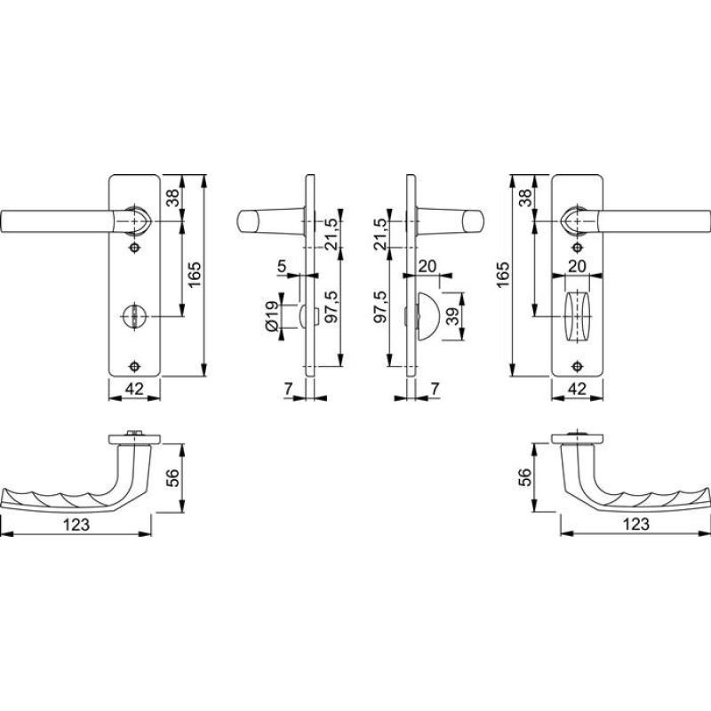 Innentür-Kurzschild-Garnitur · Profilstift-Verbindung (Stift-Lochteil, 8mm Vierkant) · Lagerung: Türgriffe lose, wartungsfreie Gleitlager · sichtbare Verschraubung · Kunststoff-Anschlagplatte und Mehrzweckschrauben · Vierkant 8mm · Anschlagrichtung DIN links / rechts Entfernung 78 mm