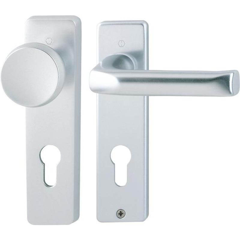für Zimmertüren · Schilder innen sichtbar verschraubt · Innenschild: Länge 165 mm, · für Türstärke 37 - 47 mm · mit Knopfschild 54 / 227K · Vierkant 8 mm · Anschlagrichtung DIN links / rechts · Entfernung 72 mm