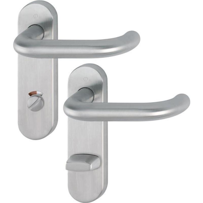 Kurzschild-Garnitur für Innentüren / Wohnungsabschlusstüren · geprüft nach DIN EN 1906: 47-0150A und PIVCERTPlus (1.000.000 Prüfzyklen), Objekt-Garnitur (Gebrauchs-Kategorie Klasse 4) · Lagerung: Türgriffe fest/drehbar (Wechselgarnitur: außen Knopf fest), Rückholfedern, HOPPE-Steckgriff-Verbindung mit Kugel-Arretierung Sertos®, wartungsfreie Gleitlager · Verbindung: HOPPE-Profilvollstift (Drückergrt.) / HOPPE-FDW-Profilvollstift (Wechselgrt.), gehärtet · Unterkonstruktion: Stahl, Stütznocken · Befestigung: verdeckt, durchgehend, Gewindeschrauben M5 · Anschlagrichtung DIN links / rechts · TS 40 - 45 mm · Entfernung 78 mm