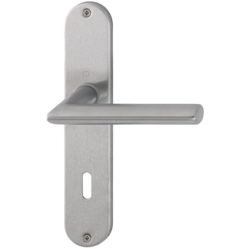 Langschild-Garnitur geprüft nach DIN EN 1906 (Gebrauchs-Kategorie Klasse 3) · Türgriffe mit Schnellstift-Verbindung (mit 8 mm Vollstift) für Türstärke 35-45 mm · Schilder sichtbar verschraubt Entfernung 72 mm · Lagerung: Türgriffe lose, wartungsfreie Gleitlager