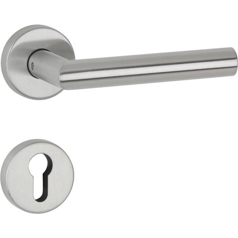 Edelstahl matt · 8 mm Vierkantstift · geprüft nach EN 1906 Klasse 3 · geeignet für DIN links / rechts · Türdrücker lose gelagert in Kunststoff-Unterkonstruktion · montagefreundliches Rosettensystem durch intelligente Vormontage von Cliprosetten und Drückerstiften · beidseitig wirkende Hochhaltefeder, rechts und links verwendbar · getrennte Montage von Rosetten und Drückerpaaren · passend für Türstärke 38?45 mm