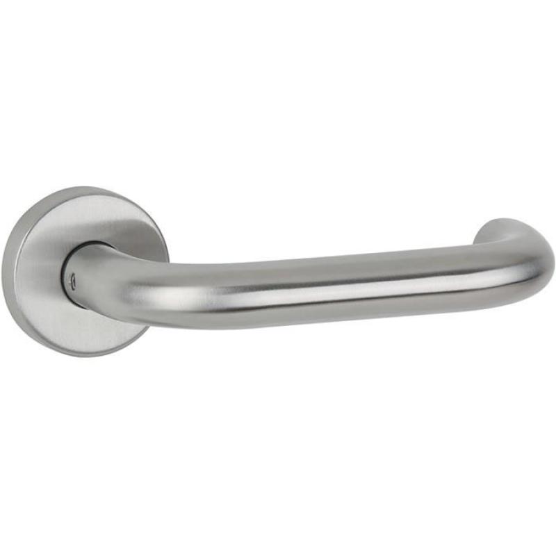 Edelstahl matt · 8 mm Vierkantstift · geprüft nach EN 1906 Klasse 3 · geeignet für DIN links / rechts · Türdrücker lose gelagert in Kunststoff-Unterkonstruktion · montagefreundliches Rosettensystem durch intelligente Vormontage von Cliprosetten und Drückerstiften · beidseitig wirkende Hochhaltefeder, rechts und links verwendbar · getrennte Montage von Rosetten und Drückerpaaren · passend für Türstärke 38?45 mm