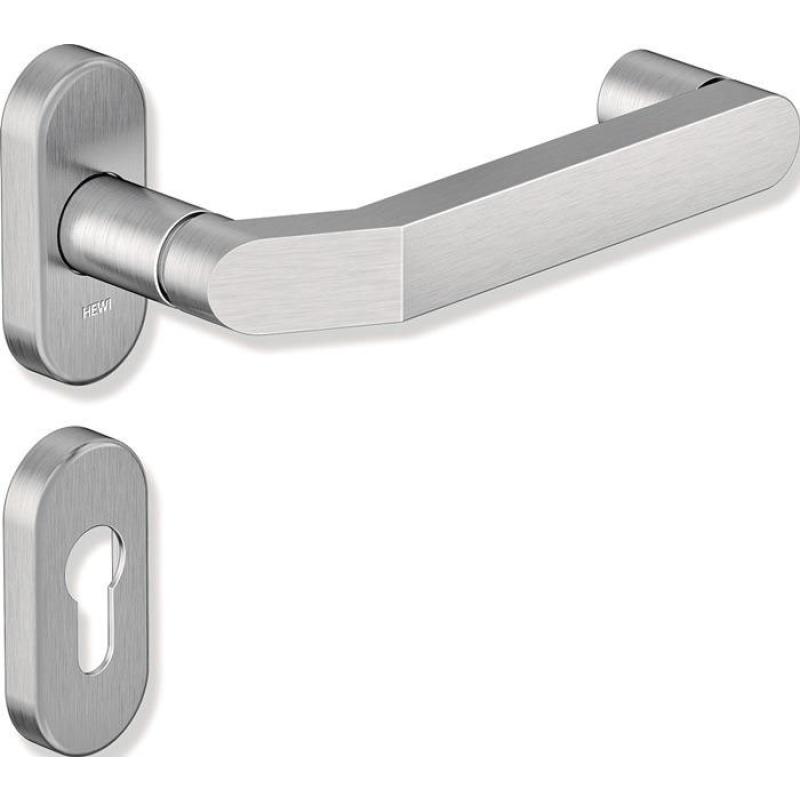 in H-Technik mit Rosetten nach DIN 18255 und DIN EN 1906 aus Edelstahl, Overfläche matt geschliffen, bestehend aus: Türdrücker Modell 273X... aus Edelstahl (1.4301), Ansatz-Durchmesser 21,3 mm, mit Ansatzführung und Rastnut, mit Gewindestift M5 als zusätzliche Fixierung der Türdrücker mit dem Vierkantstift zur optimalen Kraftübertragung in das Türblatt. Der Drücker erfüllt die Richtlinien des Bundesverbandes der Unfallkassen e. V. (BUK) - Sicherheitsabstand zur Schließkante 25 mm. Der Drücker erfüllt die Vorgaben der DIN EN 179. Montage durch einfaches Einrasten der Türdrücker in die auf der Tür vormontierten Unterteile. Die Rastung kann mittels Demontageschlüssel wieder gelöst werden. Rosetten 315.21X... und 316X..., Unterkonstruktion 315.21X... in Kunststoff-Stahlverbundbau mit schwarzer Zink/Nickel-Oberfläche für optimalen Korrosionsschutz, integriertes Hochhaltemodul mit Federunterstützung, DIN links und DIN rechts verwendbar, zur Unterstützung des Schlosses für eine längere Lebensdauer. Festdrehbarlagerung der Drücker mit selbsttätig einrastender Rundumverriegelung und 5 mm Lagerstelle als wartungsfreies Gleitlager mit elastischem Ausgleichsbereich zum Aufheben möglicher Montageungenauigkeiten. Rosetten-Abdeck-Kappe, oval, aus Edelstahl (1.4301), Durchmesser 55 mm, 12 mm hoch, 1,5 mm Wandstärke. Ausgelegt und geprüft für den Objektbereich, Gebrauchs-Kategorie nach DIN EN 1906 - Klasse 4 Garnitur, mit Vierkantstift 8 mm, für Türstärke 38-48 mm · Drückerlänge 155 mm · Rahmentürgarnitur