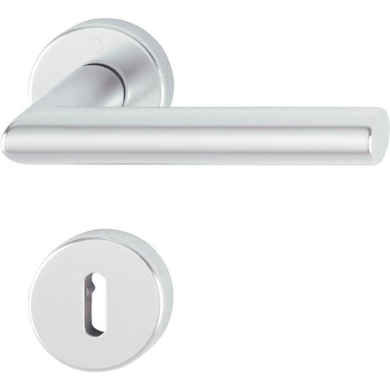 Innentür-Rosetten-Garnitur geprüft nach DIN EN 1906 ( Gebrauchs-Kategorie Klasse 3) · Aluminium, F1 / naturfarbig · Türgriffe mit Schnellstift-Verbindung (mit 8 mm Vollstift) für Türstärke 37-42 mm · Rosetten mit Kunststoff-Unterkonstruktion, Rückholfeder und Stütznocken · verdeckte, durchgehende Verschraubung mit selbstschneidenden Gewindeschrauben · Anschlagrichtung DIN links / rechts