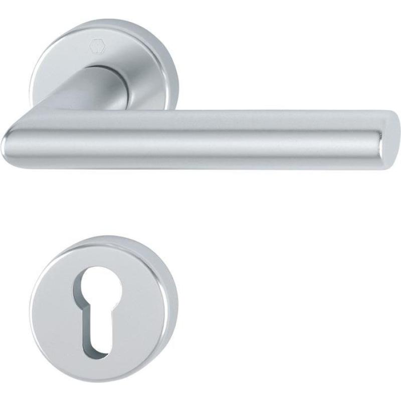 Innentür-Rosetten-Garnitur geprüft nach DIN EN 1906 ( Gebrauchs-Kategorie Klasse 3) · Aluminium, F1 / naturfarbig · Türgriffe mit Schnellstift-Verbindung (mit 8 mm Vollstift) für Türstärke 37-42 mm · Rosetten mit Kunststoff-Unterkonstruktion, Rückholfeder und Stütznocken · verdeckte, durchgehende Verschraubung mit selbstschneidenden Gewindeschrauben · Anschlagrichtung DIN links / rechts