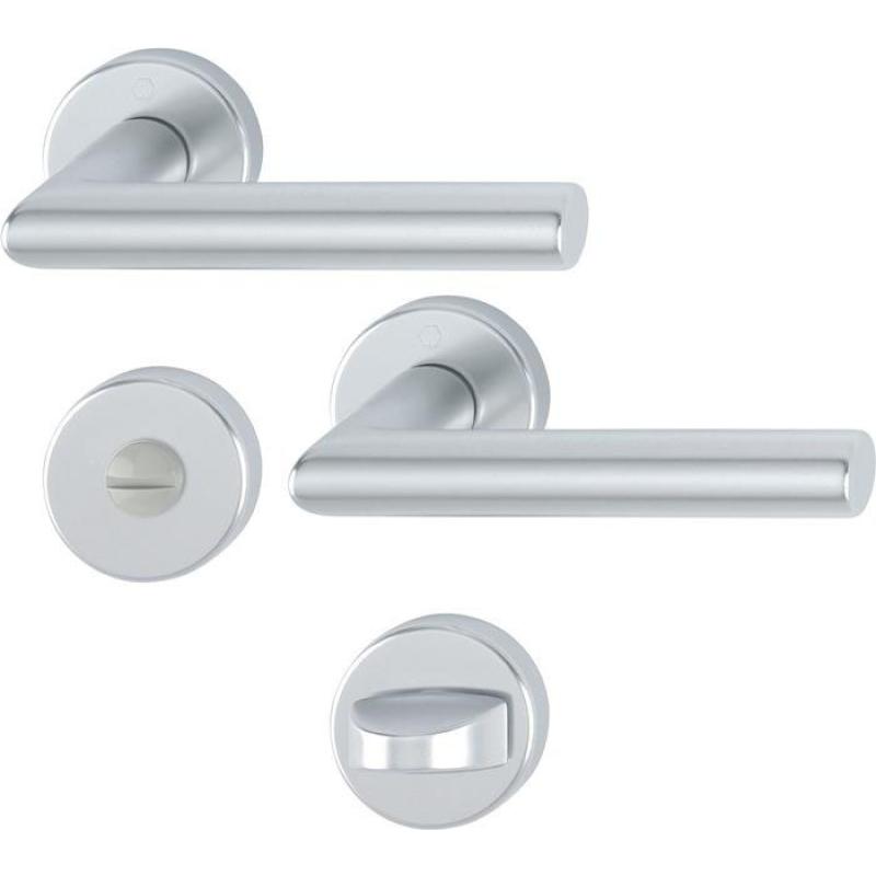 Innentür-Rosetten-Garnitur geprüft nach DIN EN 1906 ( Gebrauchs-Kategorie Klasse 3) · Aluminium, F1 / naturfarbig · Türgriffe mit Schnellstift-Verbindung (mit 8 mm Vollstift) für Türstärke 37-42 mm · Rosetten mit Kunststoff-Unterkonstruktion, Rückholfeder und Stütznocken · verdeckte, durchgehende Verschraubung mit selbstschneidenden Gewindeschrauben · Anschlagrichtung DIN links / rechts