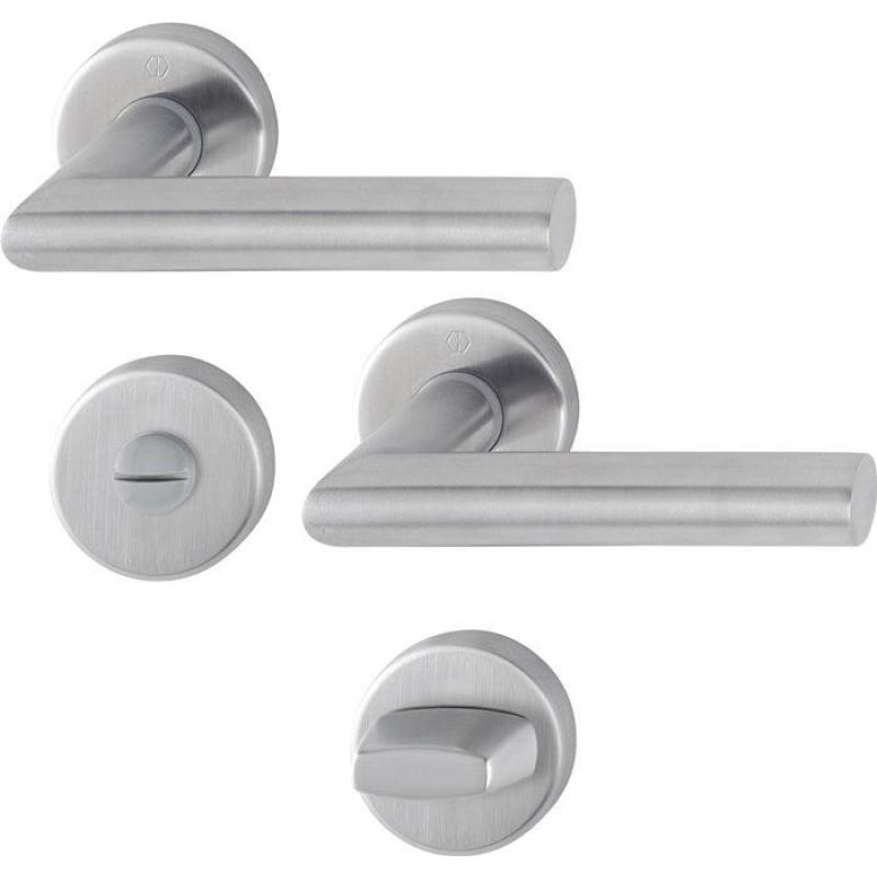 Innentür-Rosetten-Garnitur geprüft nach DIN EN 1906 (Gebrauchs-Kategorie Klasse 3) · Edelstahl, matt · Türgriffe mit Schnellstift-Verbindung (mit 8 mm Vollstift) für Türstärke 37-42 mm · Rosetten mit Kunststoff-Unterkonstruktion, Rückholfeder und Stütznocken · verdeckte, durchgehende Verschraubung mit selbstschneidenden Gewindeschrauben · Anschlagrichtung DIN links / rechts