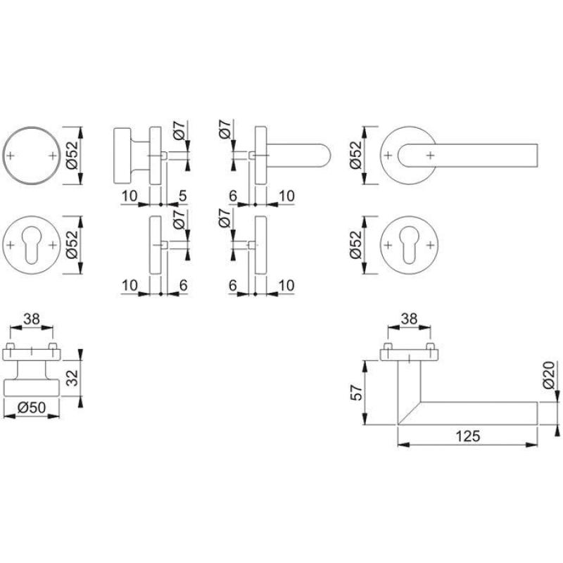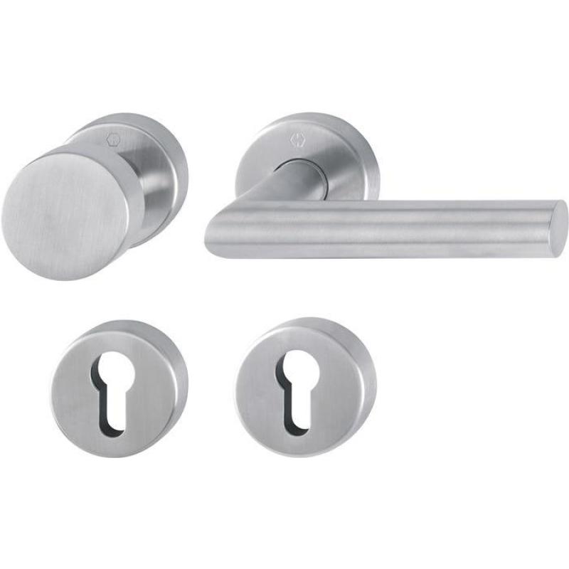 Rosetten-Garnitur mit Schlüsselrosetten für Innentüren · geprüft nach DIN EN 1906: 47-0150A und PIVCERTPlus (1.000.000 Prüfzyklen), Objekt-Garnitur (Gebrauchs-Kategorie Klasse 4) · Lagerung: Türgriffe fest/drehbar (Wechselgarnitur: außen Knopf fest), Rückholfedern, HOPPE-Steckgriff-Verbindung mit Kugel-Arretierung Sertos®, wartungsfreie Gleitlager · Verbindung: HOPPE-Profilvollstift (Drückergrt.) / HOPPE-FDW-Profilvollstift (Wechselgrt.), gehärtet · Unterkonstruktion: Griff-/Knopfrosetten Stahl, Schlüsselrosetten Kunststoff, Stütznocken · Befestigung: verdeckt, durchgehend · Griff-/Knopfrosetten Gewindeschrauben M5 · Schlüsselrosetten Mehrzweckschrauben, wechselseitig · TS 40 - 45 mm