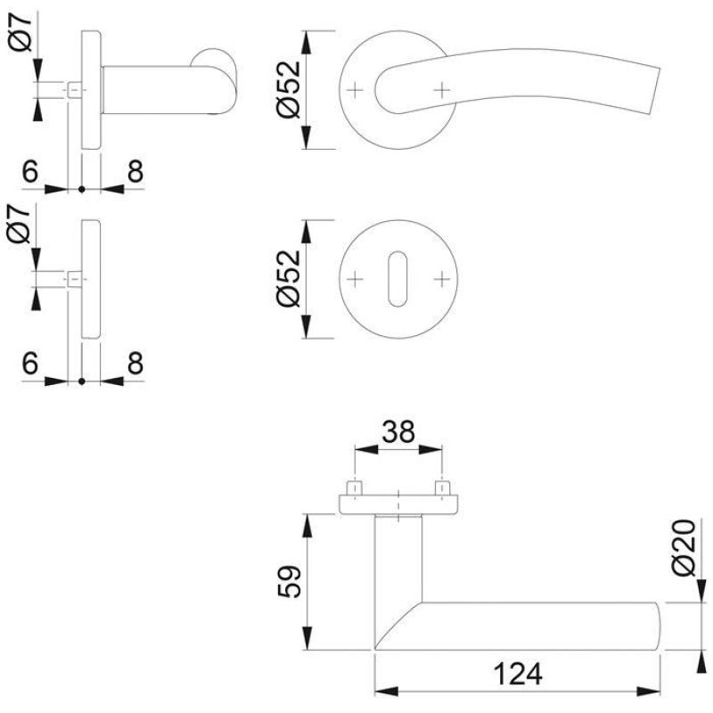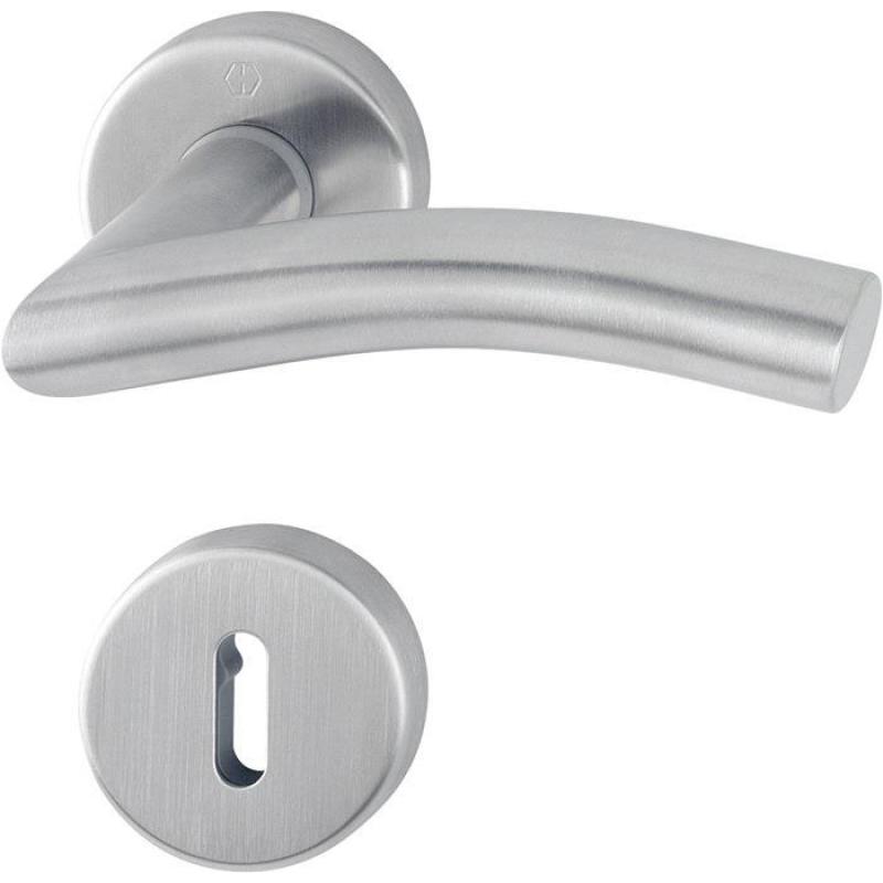 Rosetten-Garnitur mit Schlüsselrosetten · geprüft nach DIN EN 1906: 37-0140A (Gebrauchs-Kategorie Klasse 3), Objekt-Garnitur · Lagerung: Türgriffe lose, Rückholfedern rechts/links verwendbar , wartungsfreie Gleitlager · mit Schnellstift-Verbindung bei D/D mit HOPPE-Vollstift (Loch-/Lochteil), bei K/D mit HOPPE-FDW-Vollstift (Lochteil)· Unterkonstruktion: Kunststoff, Stütznocken · Befestigung: verdeckt, durchgehend, wechselseitig, Mehrzweckschrauben ACHTUNG: bei Wechselgarnituren bitte auf DIN rechts oder links achten!