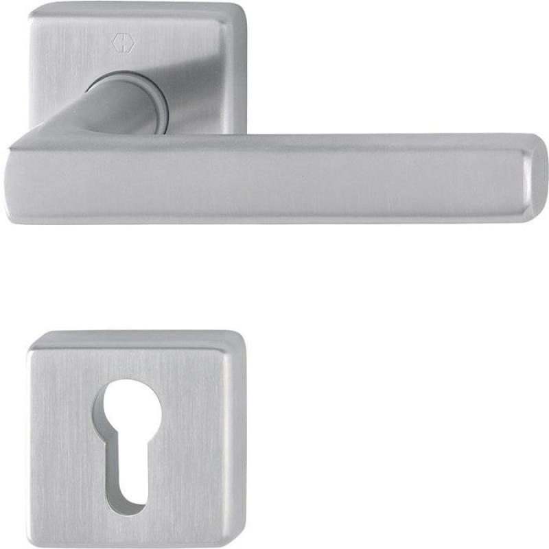 Innentür-Rosetten-Garnitur geprüft nach DIN EN 1906 (Gebrauchs-Kategorie Klasse 3) · Türgriffe mit Schnellstift-Verbindung (8 mm Vierkant) für Türstärke 37-42 mm und Rückholfeder · Rosetten mit Stütznocken unsichtbar verschraubt · Edelstahl matt · Anschlagrichtung DIN links / rechts