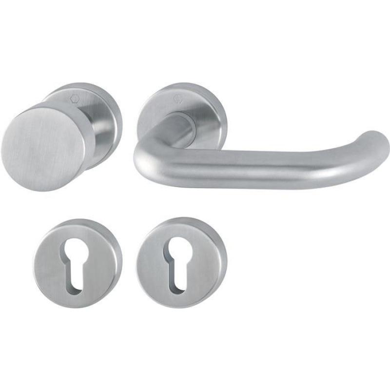 Innentür-Rosetten-Garnitur geprüft nach DIN EN 1906 (Gebrauchs-Kategorie Klasse 3) · Türgriffe mit Schnellstift-Verbindung (mit 8 mm Vollstift) für Türstärke 37-42 mm · Rosetten mit Kunststoff-Unterkonstruktion, Rückholfeder und Stütznocken · verdeckte, durchgehende Verschraubung mit selbstschneidenden Gewindeschrauben · Anschlagrichtung DIN links / rechts
