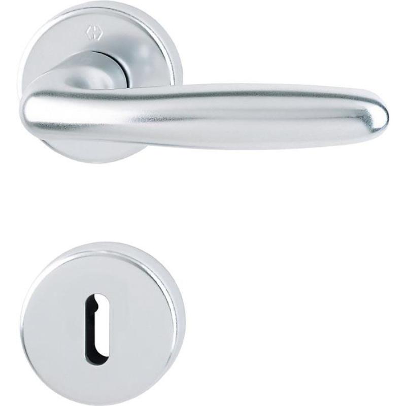 HOPPE-SchnellstiftPlus-Aluminium-Rosetten-Türgriff-Garnitur TS 37 - 47 mm mit Schlüsselrosetten für Innentüren: geprüft nach DIN EN 1906: 37-0140A, Objekt-Garnitur Lagerung: Türgriffe lose, Rückholfedern rechts/links verwendbar, wartungsfreie Gleitlager · Verbindung: HOPPE-Schnellstift mit HOPPE-Vollstift (Stift-/Lochteil) Unterkonstruktion: Kunststoff, glasfaserverstärkte Stütznocken Befestigung: zusammensteckbare Rosetten mit durchgehenden Stütznocken, stufenlos verstellbar · schraubenlose Montage