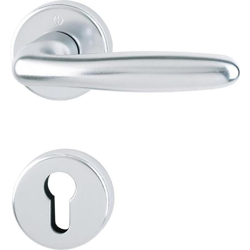 HOPPE-SchnellstiftPlus-Aluminium-Rosetten-Türgriff-Garnitur TS 37 - 47 mm mit Schlüsselrosetten für Innentüren: geprüft nach DIN EN 1906: 37-0140A, Objekt-Garnitur Lagerung: Türgriffe lose, Rückholfedern rechts/links verwendbar, wartungsfreie Gleitlager · Verbindung: HOPPE-Schnellstift mit HOPPE-Vollstift (Stift-/Lochteil) Unterkonstruktion: Kunststoff, glasfaserverstärkte Stütznocken Befestigung: zusammensteckbare Rosetten mit durchgehenden Stütznocken, stufenlos verstellbar · schraubenlose Montage