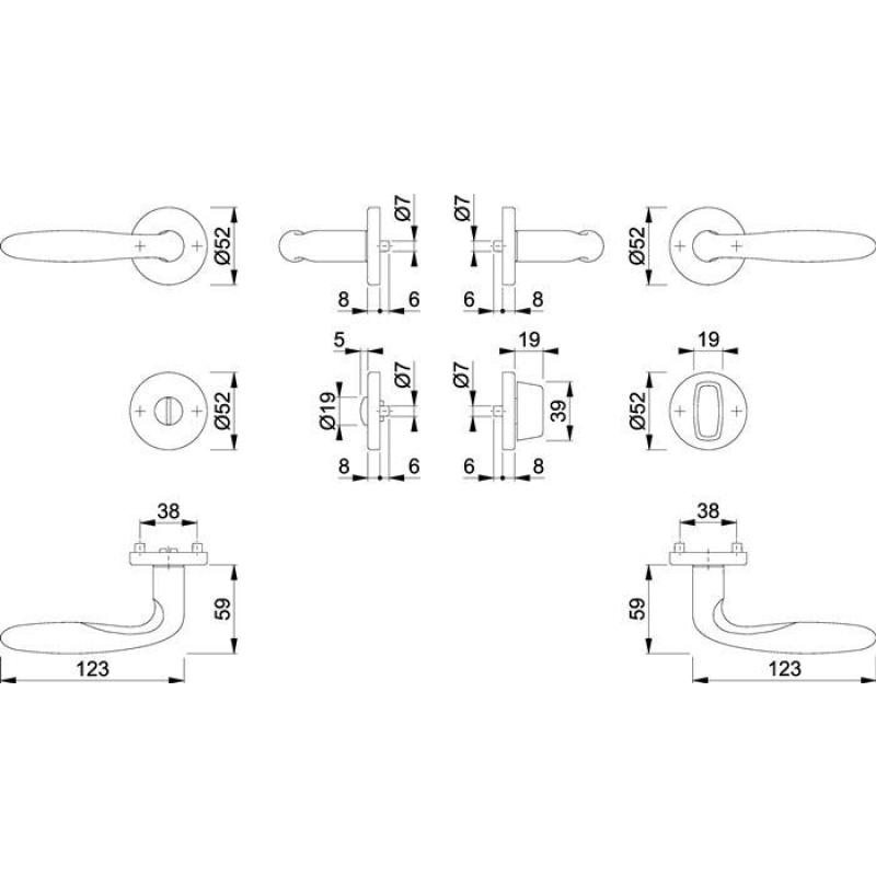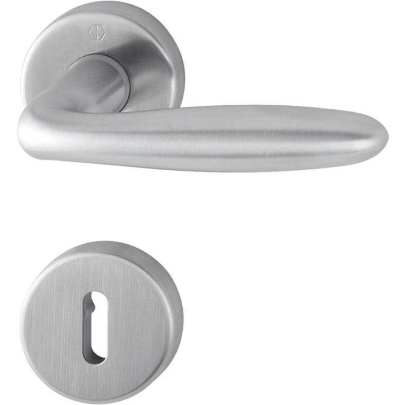 HOPPE-Edelstahl-Rosetten-Türgriff-Garnitur mit Schlitzkopf/Olive für Bad/WC-Türen: geprüft nach DIN EN 1906: 37-0140A · Objekt-Garnitur Lagerung: Türgriffe lose · Rückholfedern rechts/links verwendbar · wartungsfreie Gleitlager Verbindung: HOPPE-Schnellstift mit HOPPE-Vollstift (Stift-/Lochteil) Unterkonstruktion: Kunststoff · Stütznocken Befestigung: verdeckt · durchgehend · wechselseitig · Mehrzweckschrauben