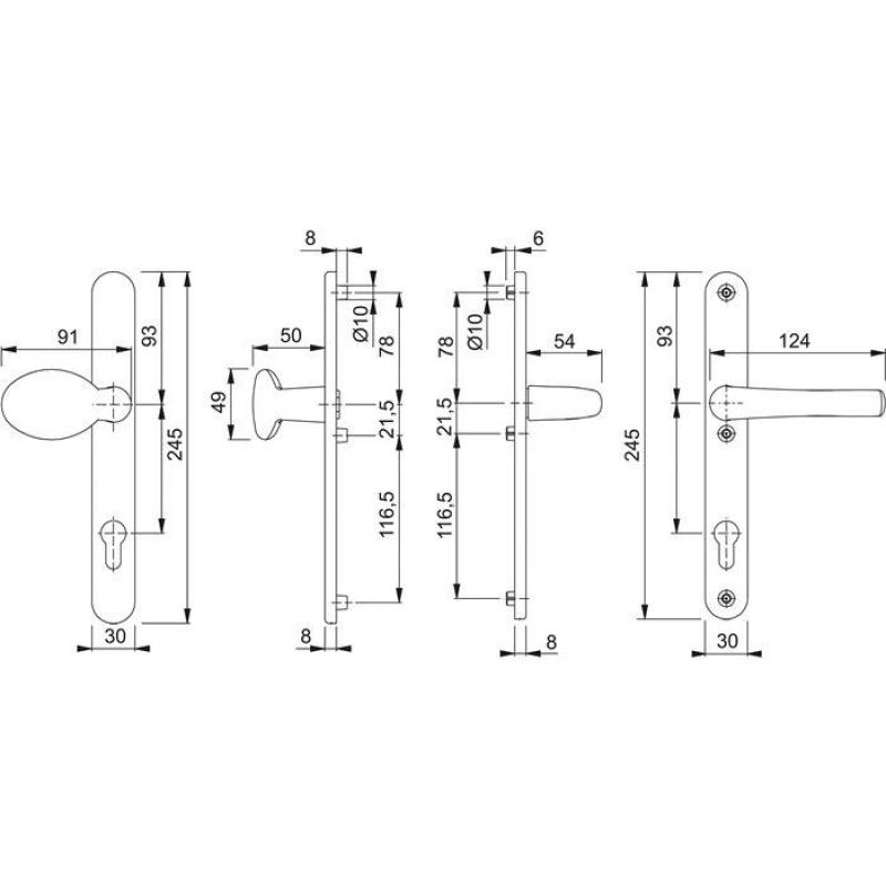 Wechselgarnitur für Profiltüren · fest/drehbar gelagert · Schilder mit Edelstahl-Unterkonstruktion und Stütznocken · außen: nicht sichtbar verschraubt · innen: sichtbare Verschraubung M6 · Entfernung 92 mm · Vierkant 8 mm · DIN links / rechts