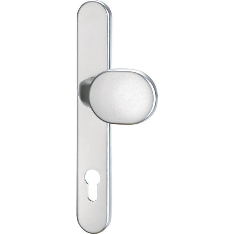 Wechselgarnitur für Rahmentüren · Entfernung 92 mm · Vierkant 8 mm · PZ-gelocht · Drücker fest-drehbar gelagert · mit Hochhaltefeder · Clipschildtechnik auf Druckgussunterkonstruktion · Stärke 10 mm · Höhe 245 mm · Breite 36 mm · Verschraubung von innen nach außen · unsichtbar verschraubt · DIN links / rechts · Lieferung ohne Stift und Schrauben