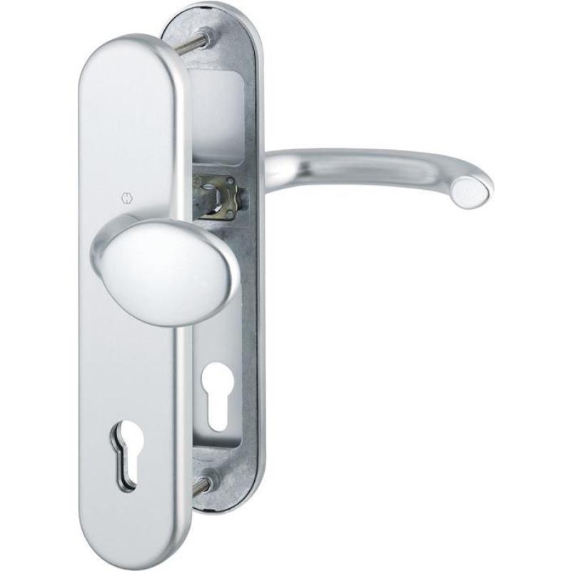 Aluminium-Schutz-Langschild-Garnitur für Außen-/Wohnungsabschluss-Türen · geprüft nach DIN EN 1906: 37-0142A (SK2), zertifiziert nach DIN 18257 ES1, Objekt-Garnitur (Gebrauchs-Kategorie 3) · Lagerung: Türgriffe lose (Wechselgarnitur: außen gekröpfter Knopf fest, ummontierbar), Rückholfeder rechts/links verwendbar, wartungsfreies Gleitlager · Verbindung: HOPPE-Schnellstift mit HOPPE-Vollstift (Drückergrt., Stift-/Lochteil) / HOPPE-FDW-Vollstift (Wechselgrt., Lochteil) · Unterkonstruktion: außen Stahl, innen Aluminium, Stütznocken · Befestigung: innen sichtbar, durchgehend, Gewindeschrauben M6 · Widerstandsklasse ES 1