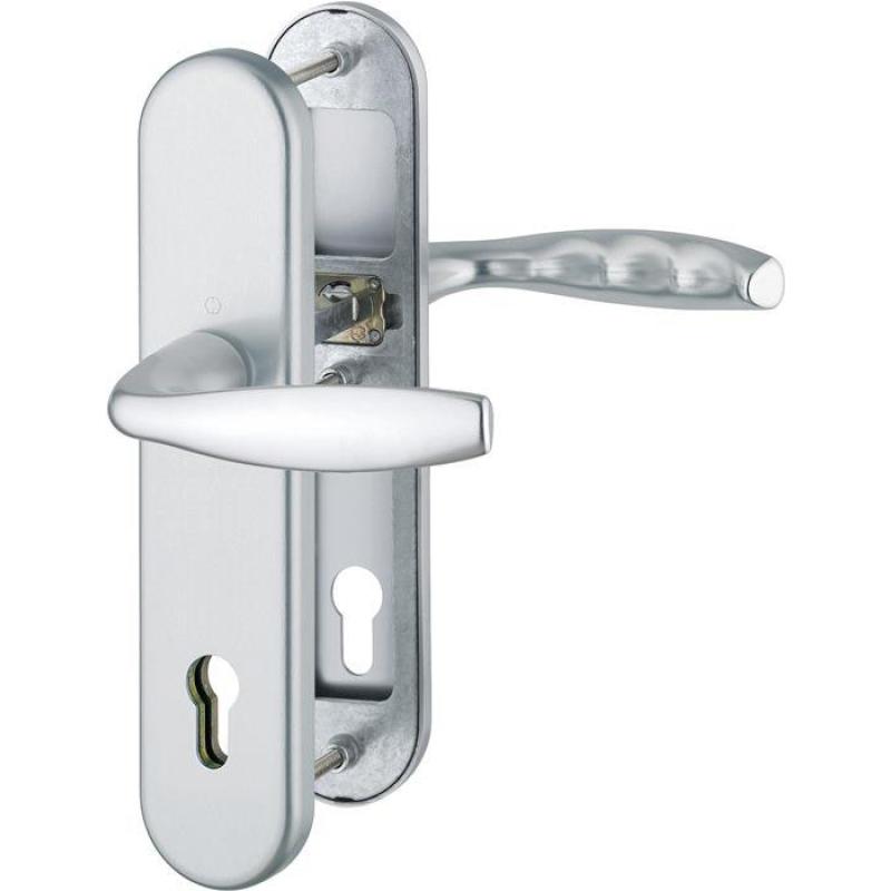 für Abschlusstüren · Stahl-Unterkonstruktion im Außen- und Aluminium-Unterkonstruktion im Innenschild · mit Rückholfederpaket · innen: loser Türgriff, Schnellstift-Verbindung (mit HOPPE-FDW-Vollstift, abgesetzter Stift bei Variante 10 mm) · sichtbare Verschraubung · Lochung PZ · DIN links / rechts verwendbar · Widerstandsklasse ES 1