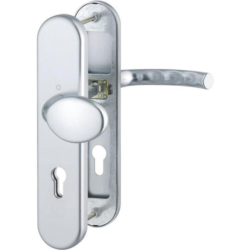 für Abschlusstüren · geprüft nach DIN EN 1906: zertifiziert nach DIN 18257 · Unterkonstruktion: außen Stahl, innen Aluminium, Stütznocken · mit Rückholfeder-Paket · loser Türgriff · mit Schnellstift-Verbindung · PZ · sichtbare Verschraubung · DIN links / rechts · Widerstandsklasse ES 1