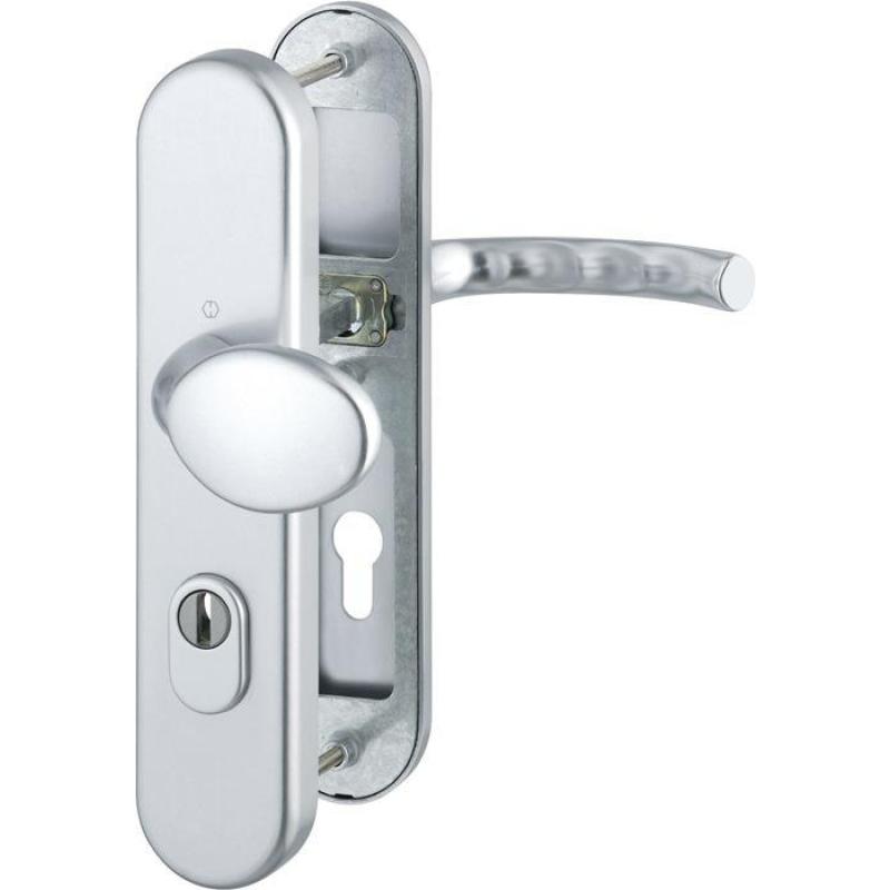 für Abschlusstüren · geprüft nach DIN EN 1906: zertifiziert nach DIN 18257 ES1 · Unterkonstruktion: außen Stahl, innen Aluminium, Stütznocken · mit Rückholfeder-Paket · außen: gekröpfter, feststehender Knopf (ummontierbar), Zylinderabdeckung aus gehärtetem Stahl für vorstehende Zylinderlänge 10 - 18 mm · innen: loser Türgriff · mit Schnellstift-Verbindung · Lochung PZ · sichtbare Verschraubung · DIN links / rechts · Widerstandsklasse ES 1