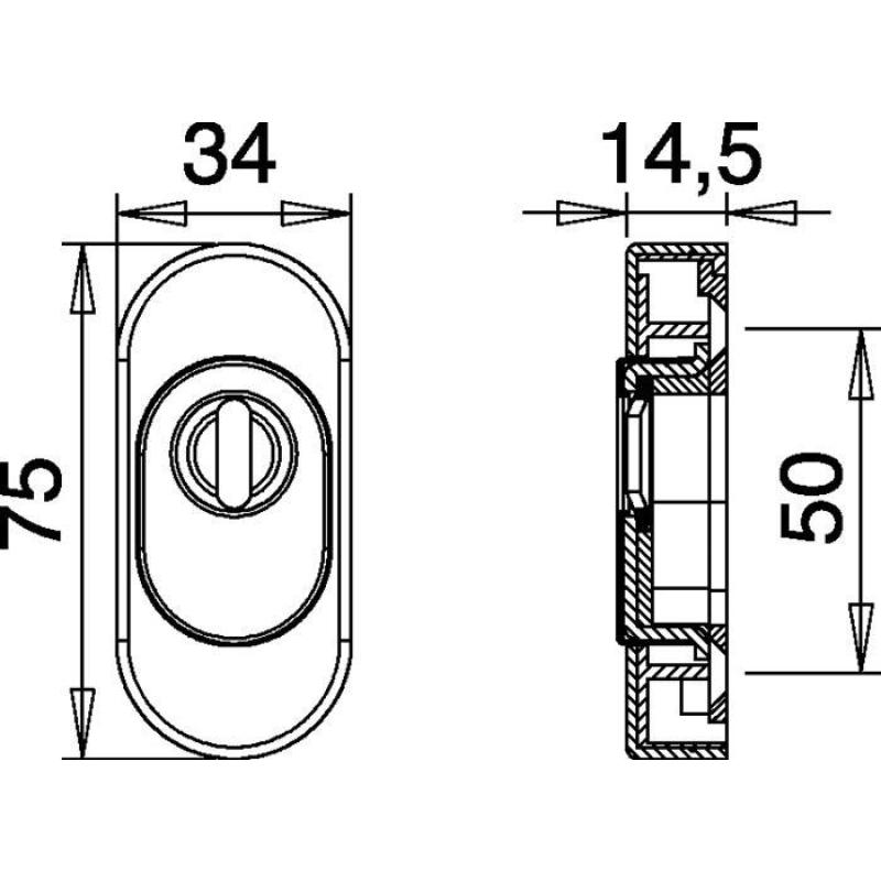 Schlüsselrosette zum Aufschieben für Rahmentüren · Lochung PZ mit Ziehschutz · für Zylinderüberstände von 11-14 mm · Stärke 14,5 mm · Höhe 75 mm · Breite 34 mm · unsichtbare Verschraubung · Lieferung ohne Schrauben