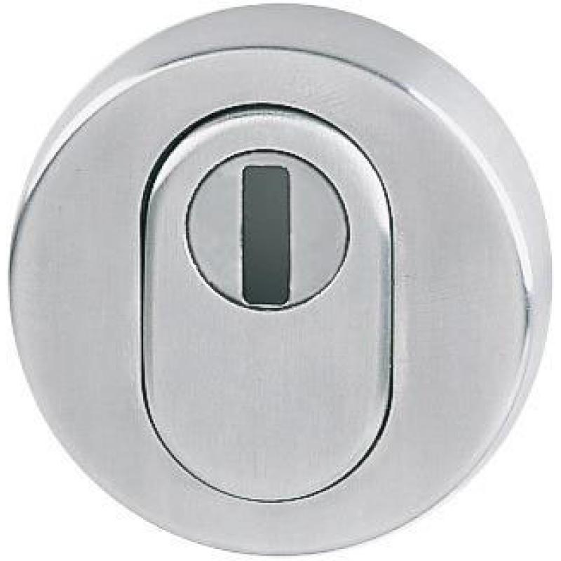 Edelstahl-Schutz-Schlüsselrosette mit Zylinder-Abdeckung für Außentüren (= 1 Stück) · Zylinderabdeckung: Stahl, für vorstehende Zylinderlänge 10-18 mm · Unterkonstruktion: Zamak, Stütznocken · Befestigung: verdeckt, durchgehend, Gewindeschrauben M5 · Stärke 15 mm · Ø 55 mm · Lochung PZ · für Türstärke 57-62 mm + 67-72 mm
